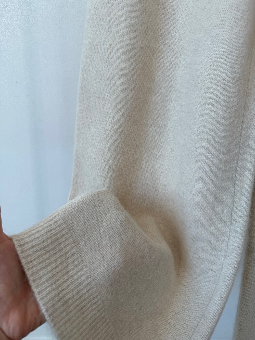 밑단은 일자로 툭 떨어지는 라인으로 넓게 잔잔한 리브조직이 편직되어 있습니다.